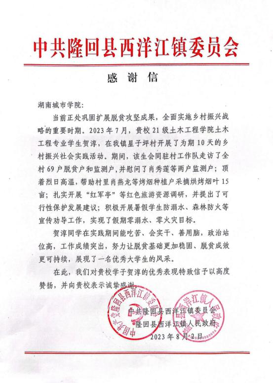 近日,公司和公司分别收到共青团隆回县委、中共隆回县西洋江镇委员会和镇人民政府发来的《感谢信》,对公司2103304班土木工程专业员工贺淳暑假服务乡村振兴社会实践志愿者活动给予高度赞扬并表示诚挚谢意。