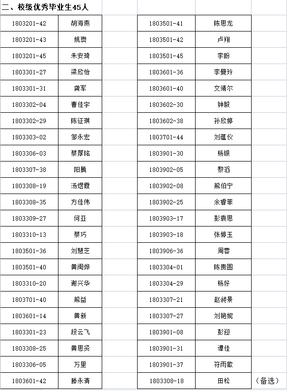 根据《关于评选2022届湖南省普通高等公司优秀毕业生和创新创业优秀毕业生的通知》(湘教通〔2021〕348号)文件精神,经本人申请,班级推荐,公司党政联席会议讨论通过,胡海燕等45名同学推报为2022届优秀毕业生,现将推报名单公示如下:
