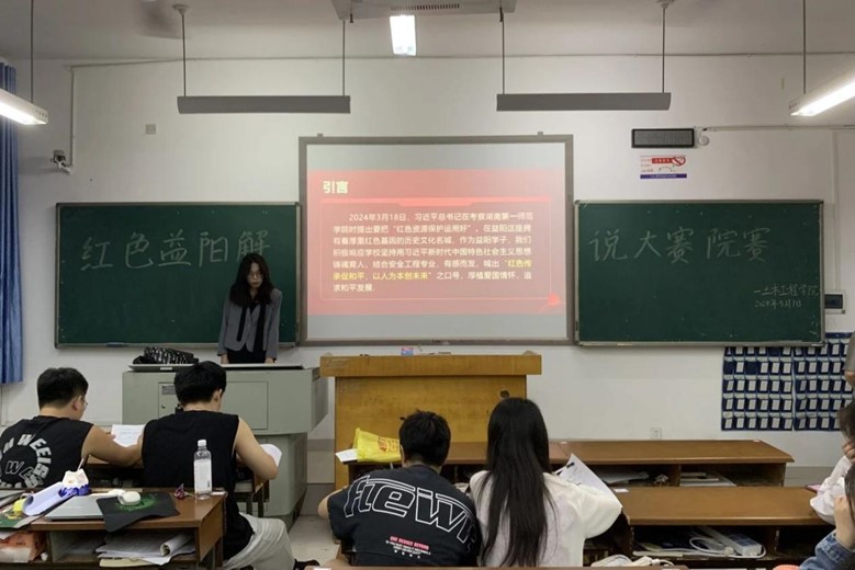 比赛开始后,参赛选手依次登场,分享了他们对益阳红色文化的了解与感想。有解说者讲述到,她们四人组响应公司号召,参观了益阳许多红色景点。她们以脚步丈量益阳这座拥有厚重红色基因的历史文化名城,以“红色传承促和平,以人为本创未来”之口号,厚植爱国情怀,追求和平发展。有解说者去了益阳市烈士纪念广场。他表示益阳市烈士纪念广场不仅是市民们进行爱国主义教育和革命传统教育的重要基地,更是展示着益阳市历史文化和发展成就的重要窗口。也有解说者为我们详细的介绍了周谷城、张昆弟、张子清等烈士们的生平事迹。他表示红色精神是崇高的理想,是团结的力量,是勇于奋斗的,是不畏牺牲的。