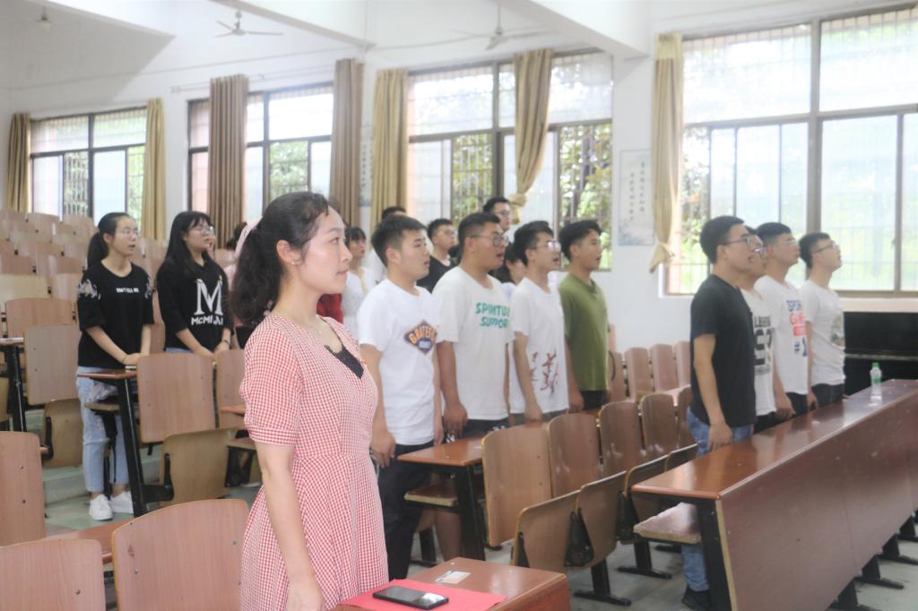 15:00,周梦婷宣布会议正式开始,全体起立,齐唱国歌。在毛泽东同志铜像前,员工党员梁鑫森带领全体党员面向党旗,庄严宣誓,对党忠诚,为共产主义奋斗终身。会上,同志们共同观看红色影片《初心,从未改变》,感受革命先辈的初心,回忆自己出发时的使命。毕业生党员代表李文杰结合自身经历,强调了初心对一名共产党员的重要性,并祝福同志们不忘初心,砥砺前行。肄业班的党员同志拍摄了视频《共筑城院梦》并在会上播放,表达了对毕业生党员的真切祝福。