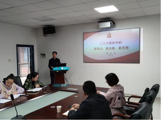 郭白泉党课的题目为《二十大报告的新观点、新论断、新思想》。他从“大会的主题”“三个务必”“新时代10年历史性成就”“三件大事”“新时代党的中心任务与首要任务”“中国式现代化的特色与本质要求”“5个坚持的重大原则”“基础性战略性支撑”“全过程人民民主”“法治中国建设”“文化自信”“国防和军队现代化建设”“生态文明建设”“一国两制与祖国统一”“党的建设伟大工程”“5个必由之路”等方面,对党的二十大报告中的新观点、新论断、新思想,提纲挈领、深入浅出,进行了解读与阐释,并和全体党员一道分享了自己的学习心得与体会。
