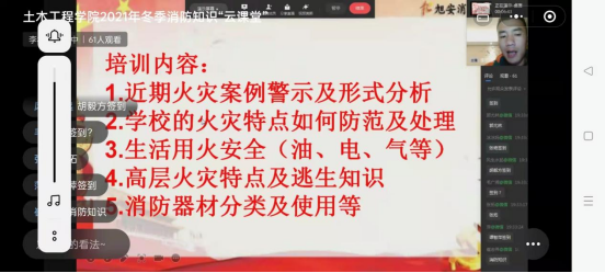 为压实安全稳定责任制,强化校园消防安全管理意识、提升公司消防管理能力与专业水平,坚决预防和遏制火灾事故发生,根据省安委办、省教育厅统一部署和安排,2021年12月26日晚7:30-9:00,公司举办“落实消防责任、防范安全风险”主题安全知识培训,培训采取创新性“云课堂”形式在线上进行,特邀旭安消防李相漾教官主讲。全院教职工及部分教职工家属参加培训。