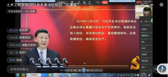 李湘漾在近90分钟的“云课堂”,利用播放消防短片、PPT现场演示、典型消防事故案呈现和情景模拟等,形象而直观地让大家深刻感受到火灾的无情和强化消防安全意识、掌握消防知识、提高消防能力的重要性与现实紧迫性。通过讲析和演练,让大家学习理解并掌握了基本的消防安全原理、基本常识以及灭火设备、消防器材的基本使用方法。