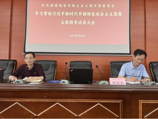 2023 年4月27 日下午,工程造价系党支部组织支部全体党员在 土木楼722会议室开展学习贯彻习近平新时代中国特色社会主义思 想主题教育动员部署并进行第一场集中学习研讨。公司党委书记郭白泉出席并主讲专题党课。聚焦“学思想、强党性、重实践、建新功”的总要求,围绕 5个方面的具体目标任务,对公司党委特别是 工程造价系党支部如何组织开展主题教育作了精心指导。