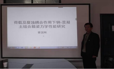 曹经理首先说明了提出该问题研究以及形成该课题研究的必要性,让大家都理解到这一课题的重要性。随后分析了国内外研究现状与发展动态,向其他老师展示了钢-混凝土组合梁耐久性研究的发展趋势。接着他表述了项目的研究内容、研究目标,并且制定了实验方案,分析了该课题的创新之处。