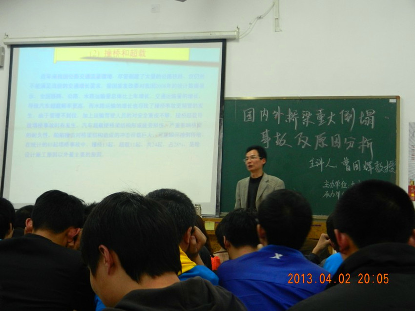 讲座中,曹国辉教授借助多媒体跟我们展示了众多桥梁倒塌的图片并且还分析了桥梁倒塌的原因。其中跟我们分析了造成桥梁倒塌的主要三个原因:一,桥梁在施工、管理、技术等存在问题;二,外界实物撞桥和超载;三,自然灾害。其主要的案列有:哈尔滨阳明滩大桥发生断裂事故、加拿大因设计缺陷垮塌的大桥 、钱江三桥引桥倒塌以及2008年汶川地震引发的众多桥梁倒塌的事件。对于这些塌桥,曹国辉教授给出了他自己的见解,其中最主要的原因为车辆严重超载、赶工期、非正常设计和施工、工程建设中的腐败问题、自然灾害等等。 除了在这众多的原因中,曹国辉教授还讲到了另外一点:从表面上看起来,桥梁设计、工程发包等问题都很合格,但是建成后还需通过严格验收,程序要严密,因为不排除某些官员腐败、道德沉沦等内在原因发生等等。