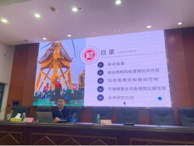 李栋教授详细阐述了风电塔筒结构的研究背景。他强调,风电塔筒作为风力发电设备的核心支撑结构,其性能直接关系到风力发电的稳定性和可靠性。因此,深入研究风电塔筒结构,对于推动风电行业的发展具有重要意义。随后,李教授从“组合结构风电塔筒的抗风性能”、“风电塔筒结构的振动控制”、“不锈钢复合风电塔筒的抗腐性能”、“未来研究方向”四个方面,系统性地阐述了海上风电组合结构的研究成果,并鼓励大家积极探索风电塔筒结构的创新设计和技术应用,为风电行业的可持续发展贡献智慧和力量。