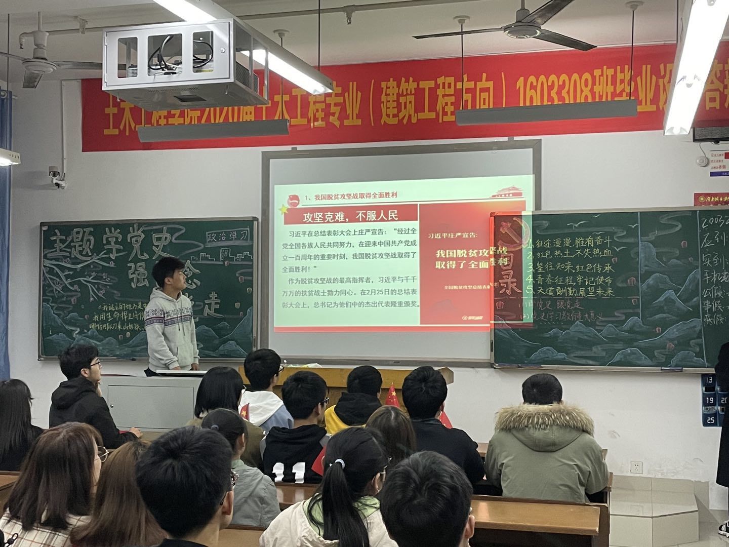 活动伊始,全体起立,奏唱共青团团歌。首先,主持人强调了活动纪律。紧接着,同学们深入学习习近平总书记在全国脱贫攻坚总结表彰大会的重要讲话,了解了脱贫攻坚所取得的重大胜利。主持人向同学们介绍了大批优秀的扶贫典范人物,并带领同学们观看了介绍优秀戍边英雄的感人视频。